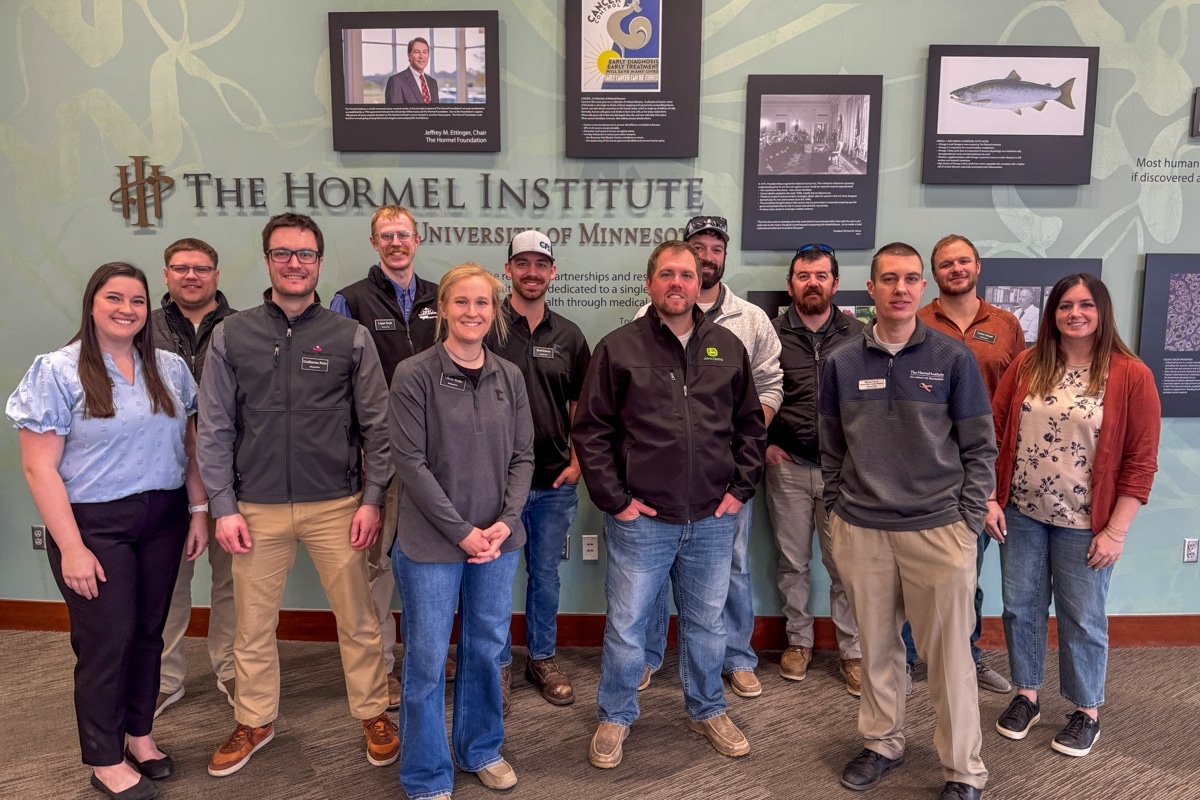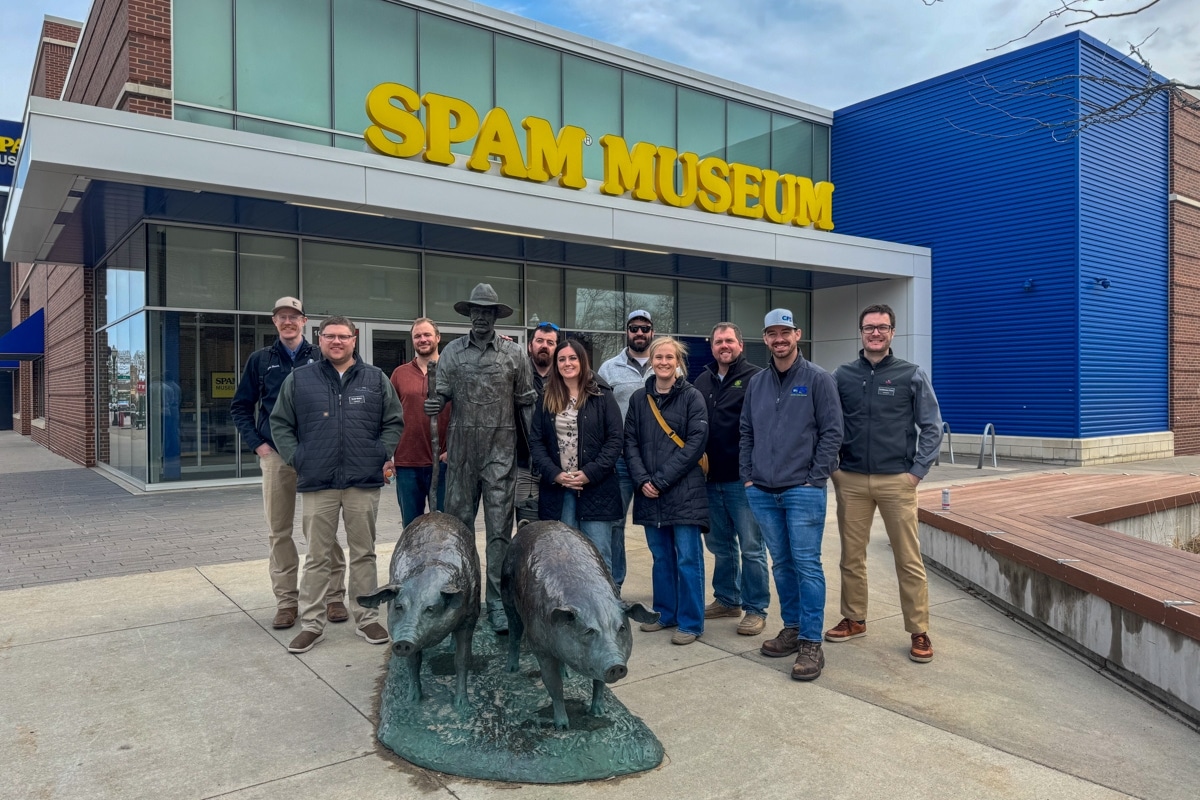 The session kicked off in Austin, MN, the birthplace and headquarters of Hormel Foods. We toured Hormel’s flagship plant alongside I-90, where more than one billion pounds of pork are produced each year, much of it sourced from Minnesota-raised pigs! The Activate class had the chance to see the processing side of the operation, watching sausage and bacon come to life through an impressively efficient and intentional process… from selecting cuts and moving through seasoning, brining, smoking, slicing, and packing up a delicious product!